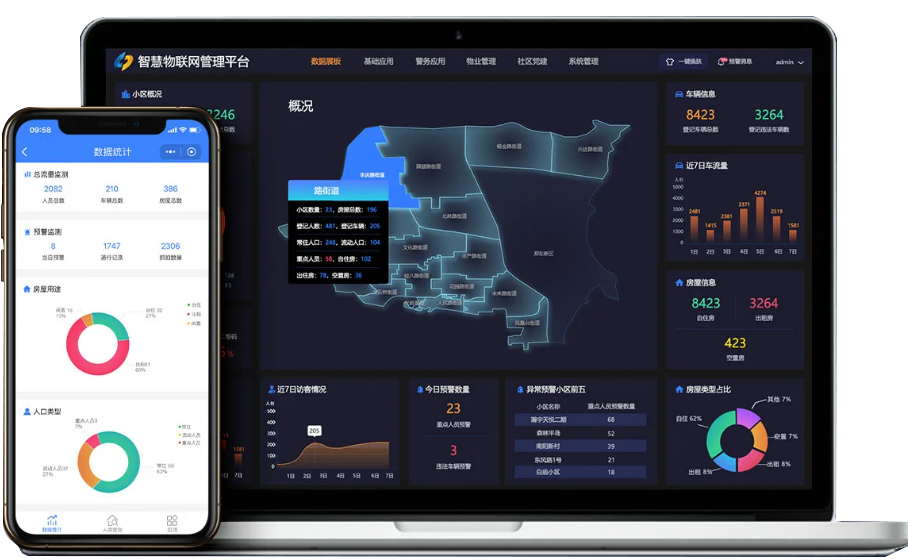 通過物聯網采集終端數據,經處理分析后將數據呈現在可視化大屏上、移動端設備上,實時感知并觀察各物聯設備的狀態及數據